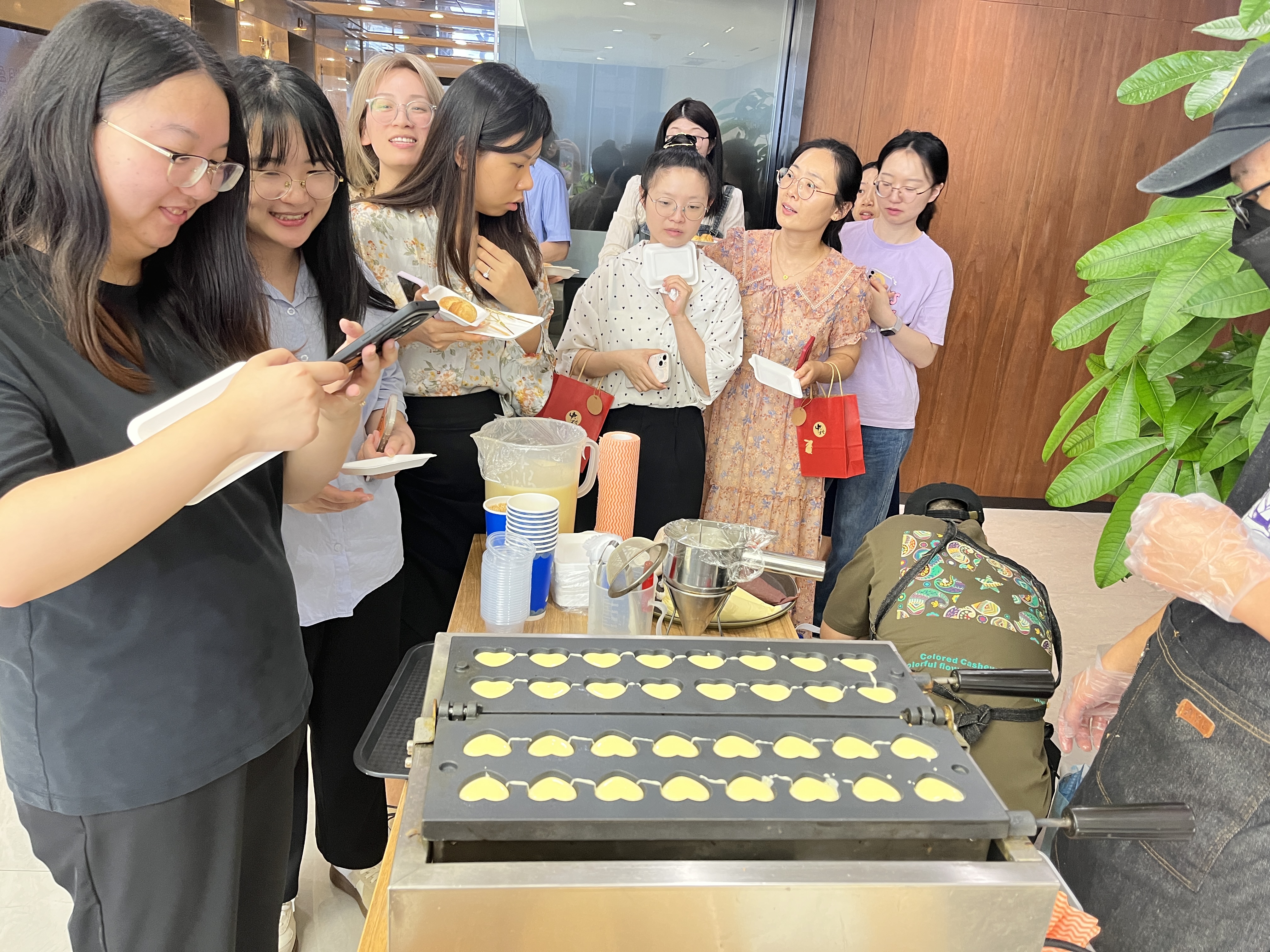 在本次活动中,我们在汉嘉国际25楼前台和泛海国际A座32楼前台布置了充满温馨的中秋氛围,还设置了中秋美食区。一系列造型可爱的中秋糕点和多种口味的迷你糖葫芦让人垂涎欲滴,尤其是现场制作的盲盒口味鸡蛋仔,更是受到了大家的热烈欢迎。